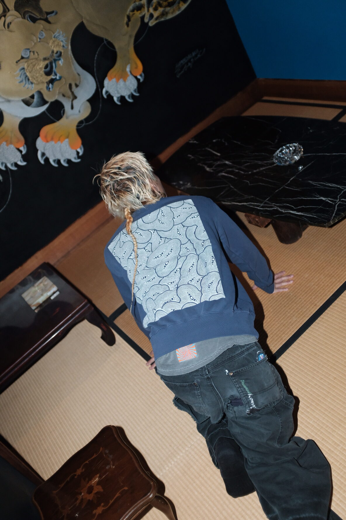 本商品は、素材の風合いや色落ち、スレ感など、あえて経年変化を楽しんでいただくために仕上げています。着用や洗濯を重ねることで、色味や質感に変化が生まれますが、特有の雰囲気としてお楽しみください。